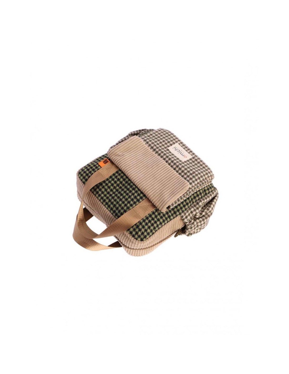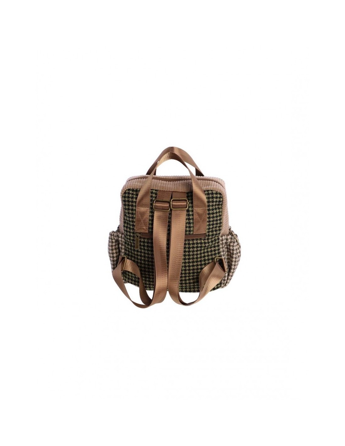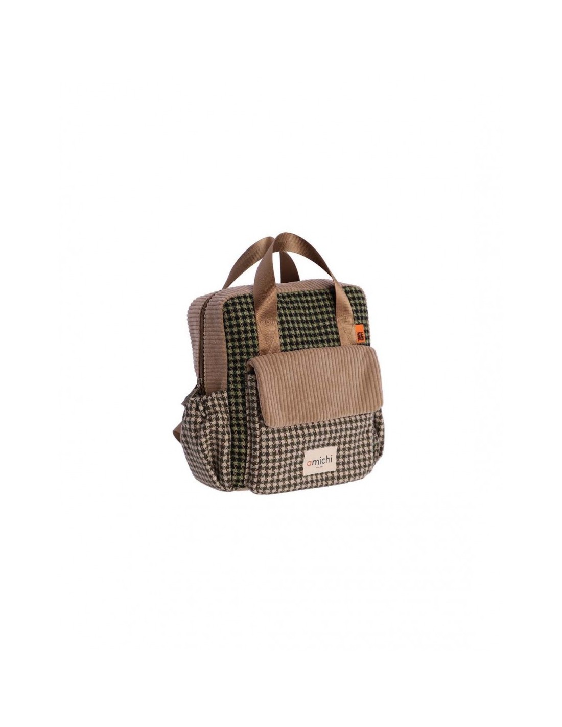 Bolso mochila para mujer Amichi Malva con tejidos en piezas diferentes, tipo pana y pata de gallo.