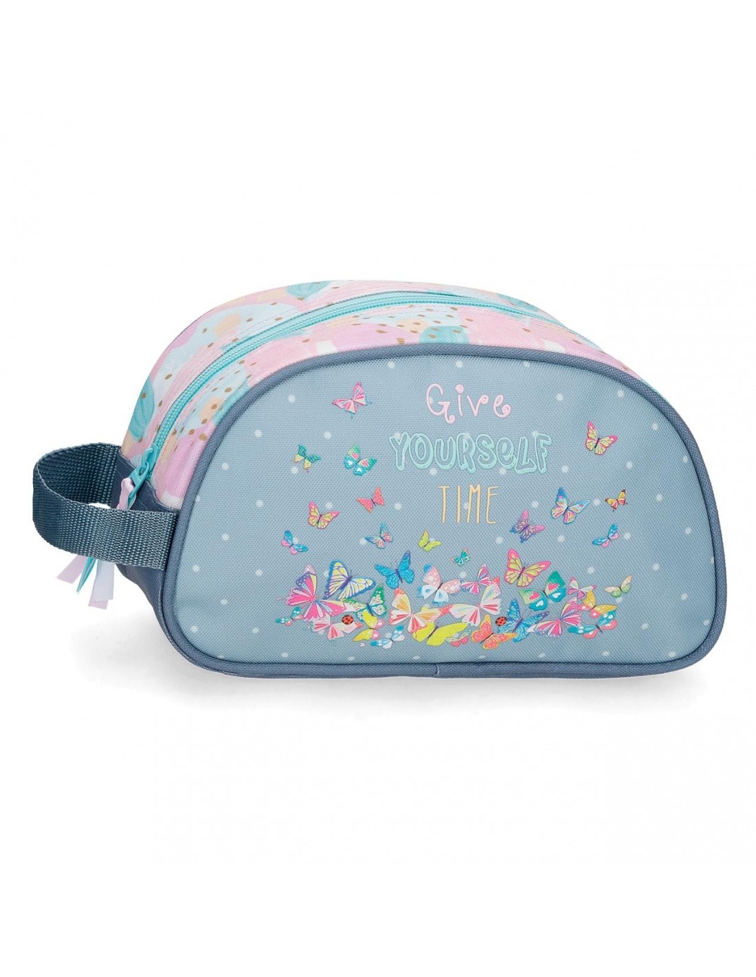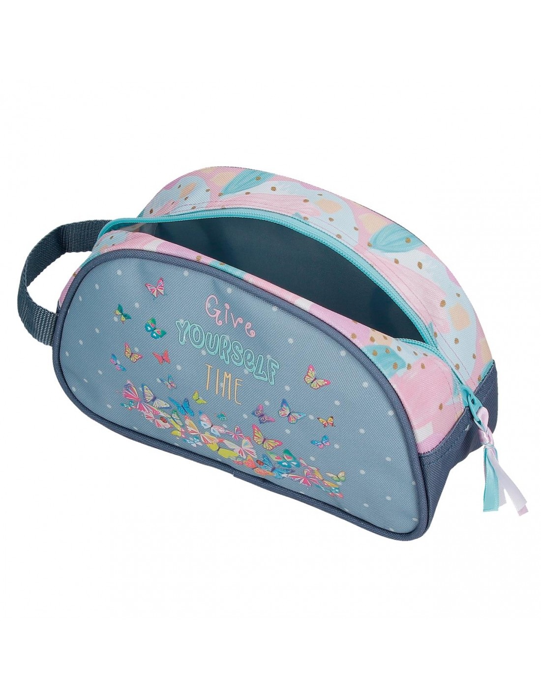 Dos compartimentos y tres bolsillos interiores, uno de ellos con cremallera, para llevar perfectamente ordenados los accesorios de aseo y los productos de belleza.