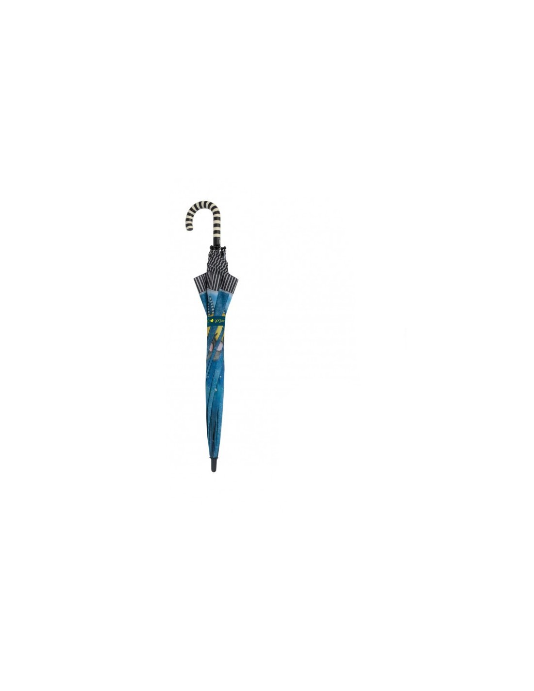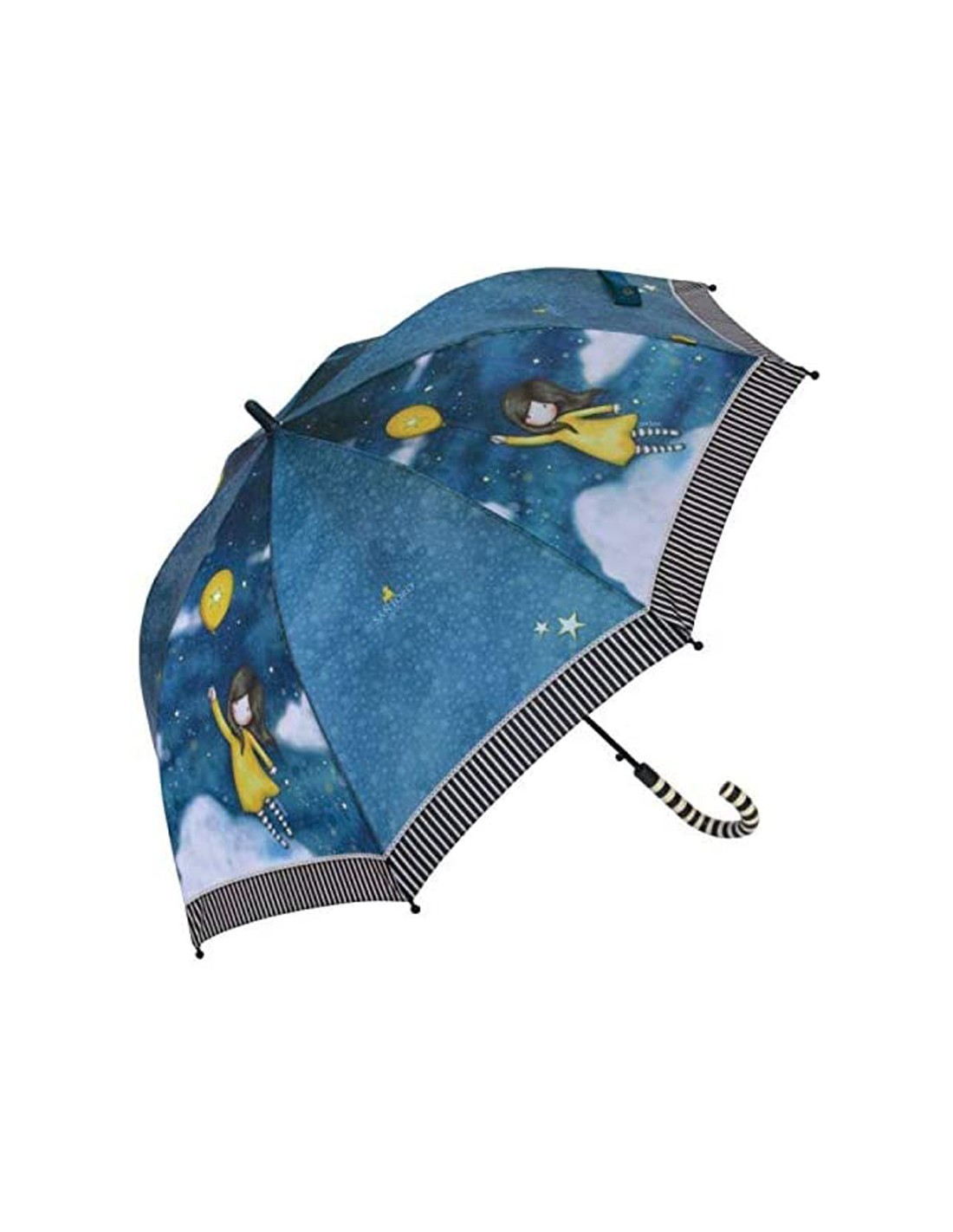 El paraguas infantil de Gorjuss Santoro de la colección Fly Away with me, The Globe presenta una cúpula en tonos azules con la ilustración de una de sus queridas muñecas Gorjuss surcando los cielos gracias a un globo.