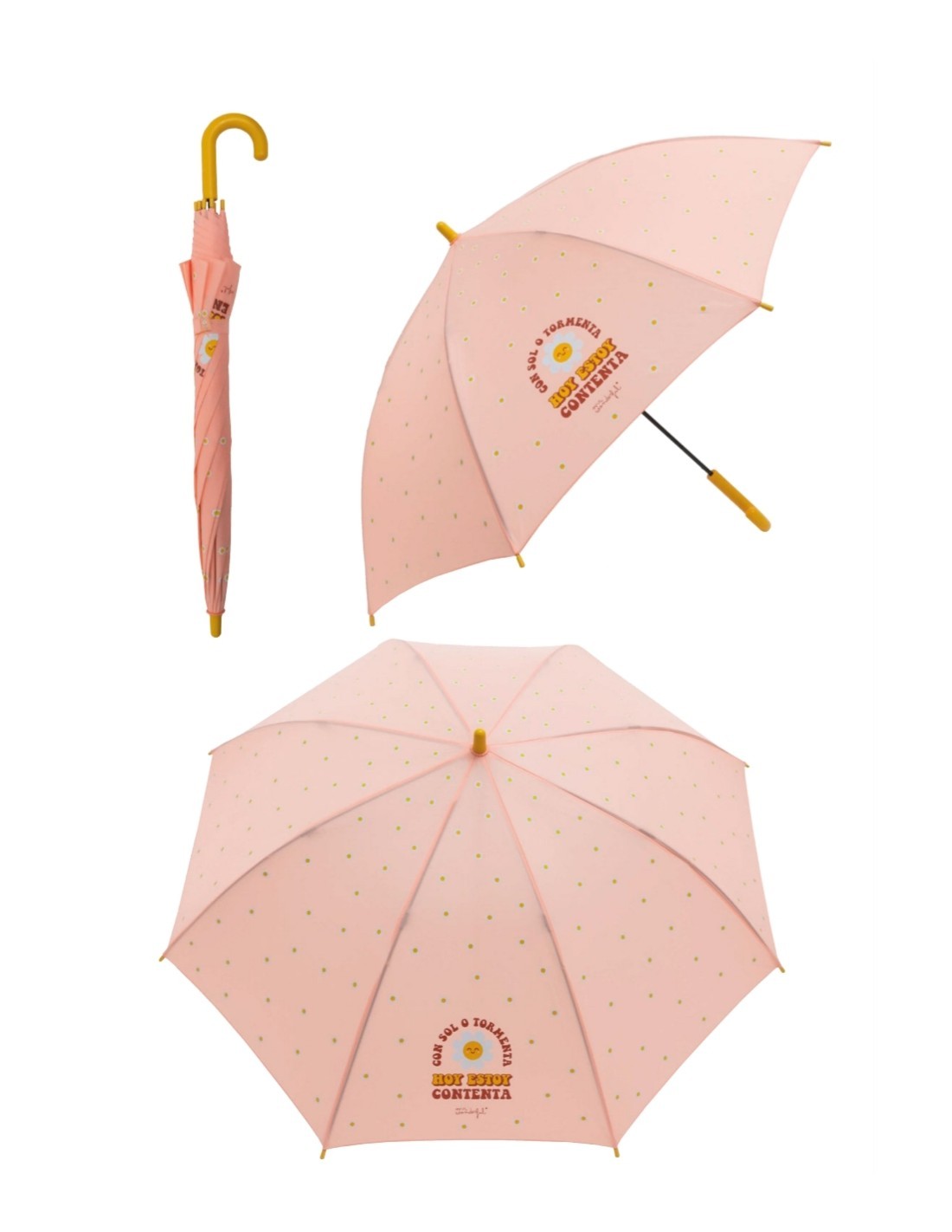 Paraguas largo de 16 varillas de la marca Mr Wonderful. Esta línea se confecciona en alegres y llamativos estampados del universo Mr Wonderful. El puño, la punta y los terminales de las varillas son del mismo color y varían según el modelo de estampado elegido.
