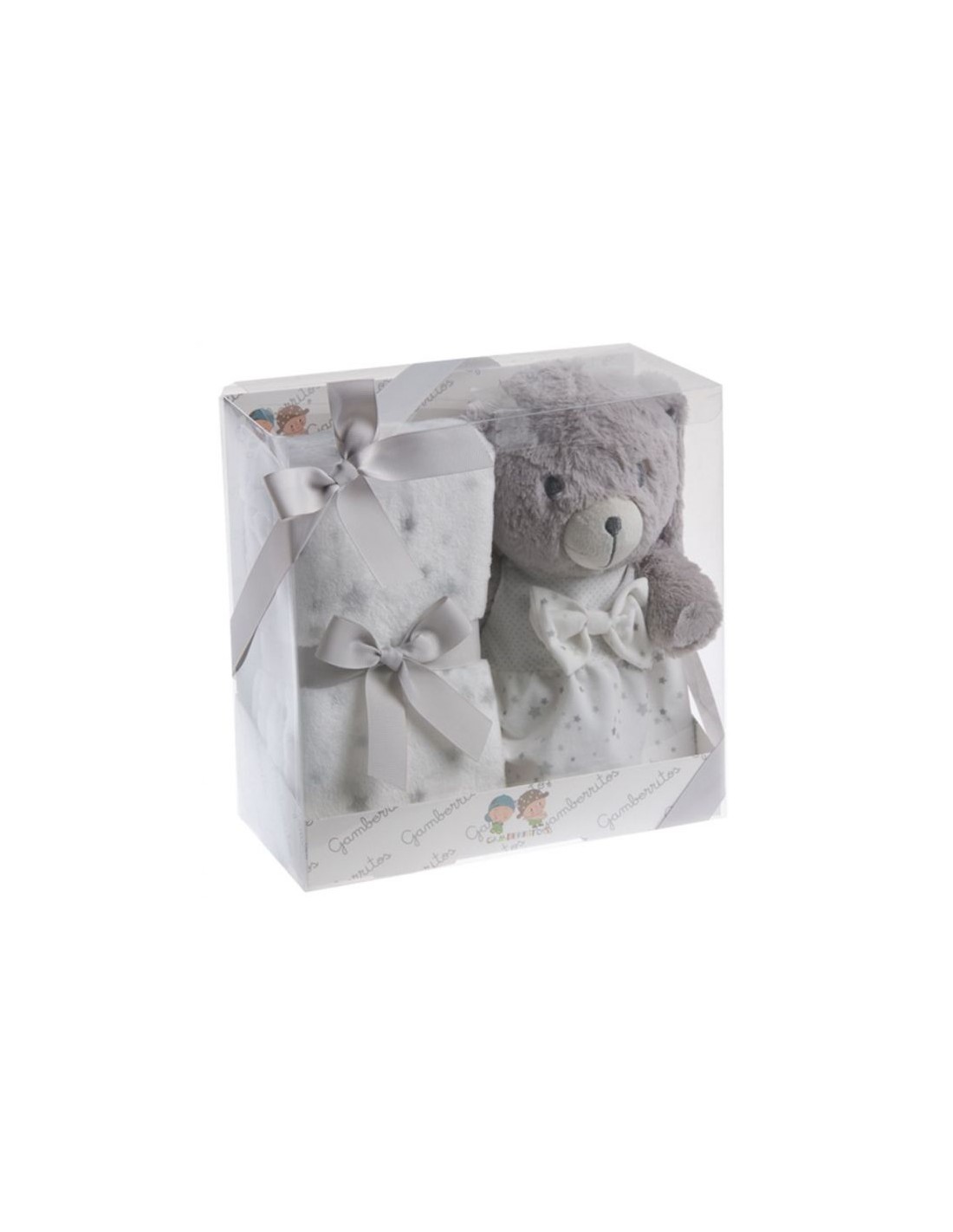 Set completo: incluye peluche conejito de 20 cm con mantita polar suave, presentado con lazo decorativo.
