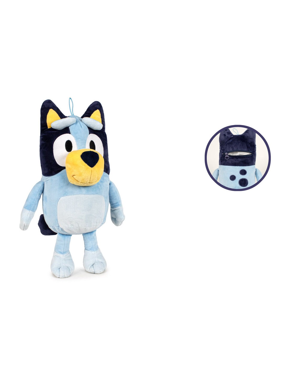 Peluche Bluey de Famosa, mide 35 centímetros con bolsillo trasero para guardar pequeños objetos.