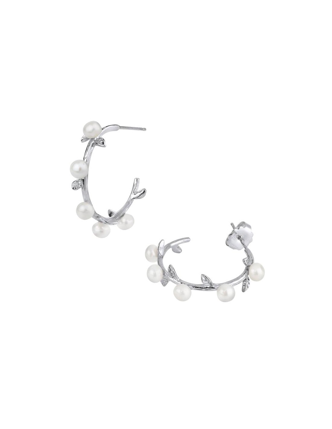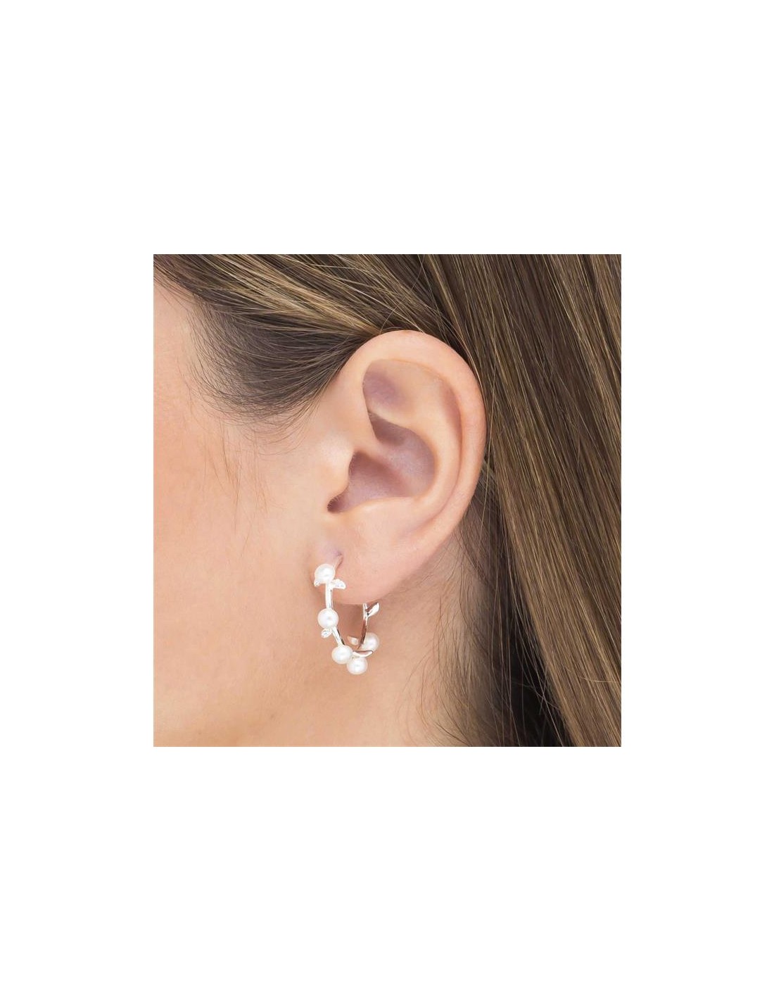 Se trata de unos pendientes llenos de elegancia y dulzura en forma de aro chapado en Plata con detalles en forma de hojas y 5 perlas, su cierre es de presión.