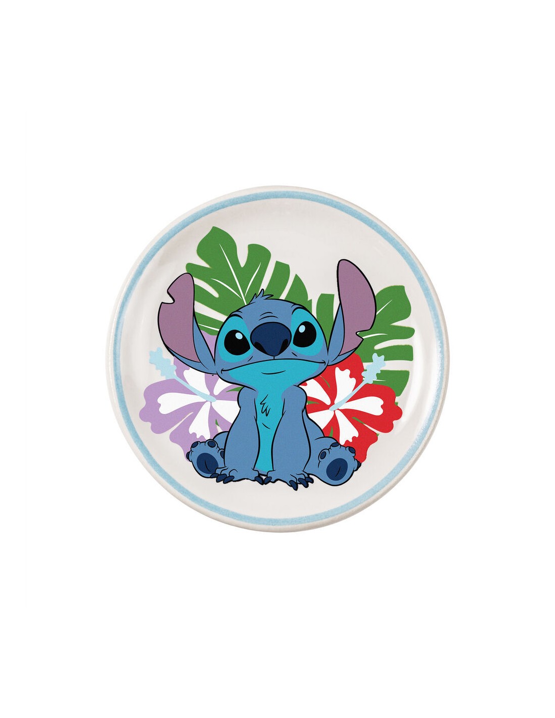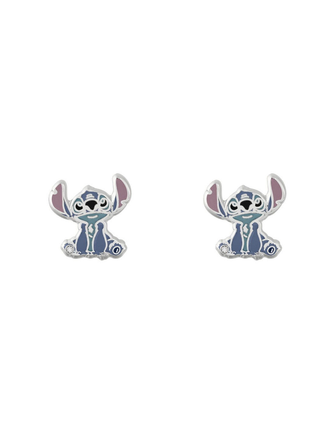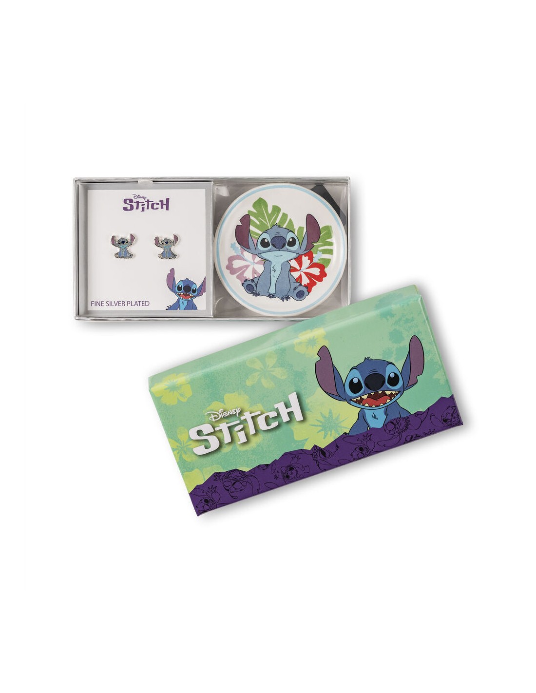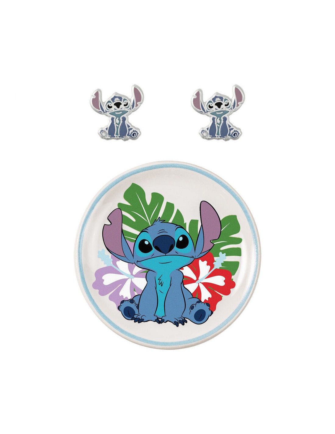 Incluye una preciosa bandeja redonda multicolor con el icónico diseño de Stitch y un par de pendientes plateados de Stitch .