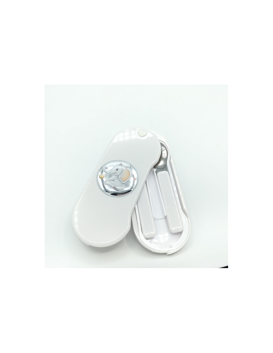 Cubiertos para bebés "Elefante sentado" con caja para llevar en el bolso.