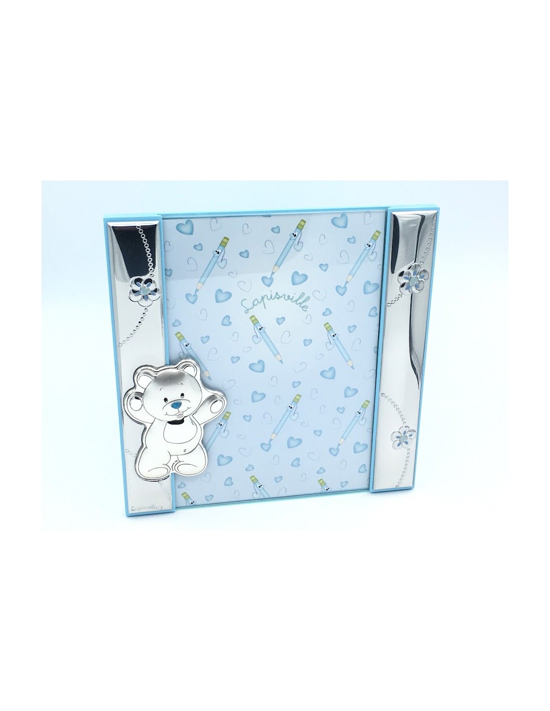 Portafotos plata laminada oso azul, parte trasera madera en azul. Medidas foto 20 x 20 cm