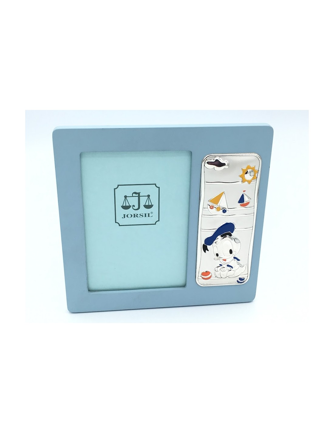 Portafotos plata laminada, parte trasera madera color azul, medidas foto 9 x 13 cm medida total 16.5 x 16 cm