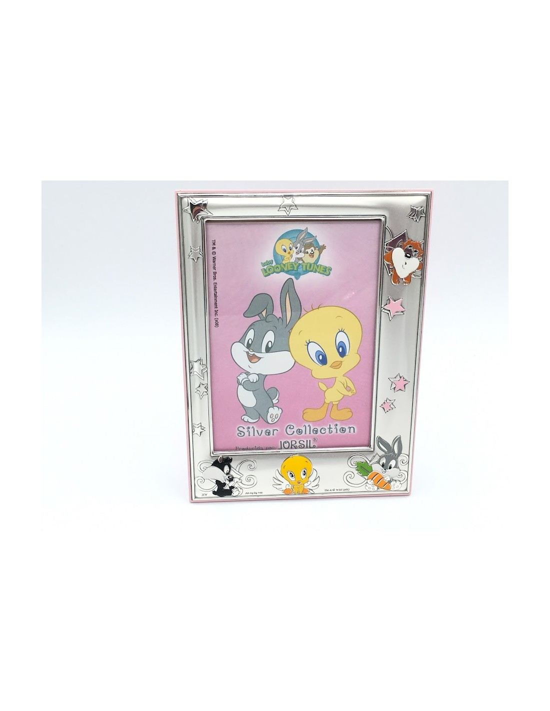 Portafotos piolín plata de ley laminada, parte trasera madera color rosa, medida foto 9 x 13 cm , medida total 13 x 17.5 cm.