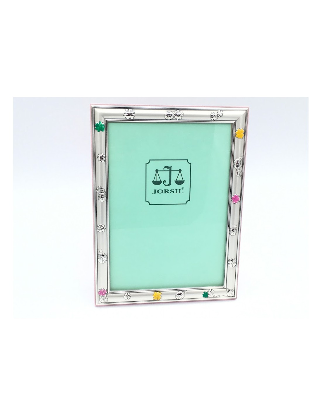 Portafotos plata de ley laminada, con florecitas y mariquitas esmalte color. Trasera de madera color rosa. Tamaño interior 13x18cm. Tamaño total 15x20cm.