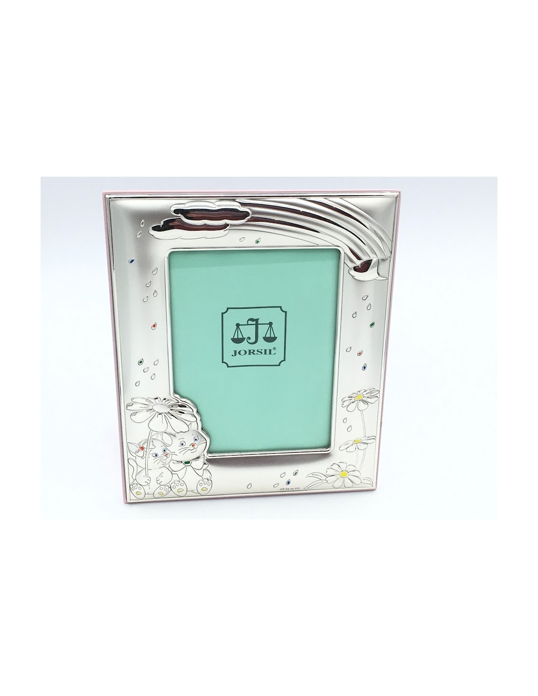 Portafotos de plata de ley laminada, gatitos lluvia, margaritas esmalte. Trasera en madera rosa. Tamaño foto: 9x13cm. Tamaño total: 15x18cm.