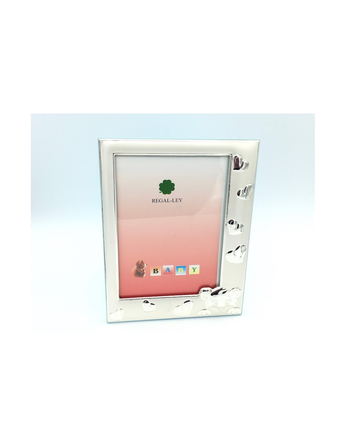 Portafotos plata de ley laminada, osito y corazones con relieve. Trasera en madera color rosa. Tamaño interior: 13x18cm. Tamaño total: 18x23.5cm.