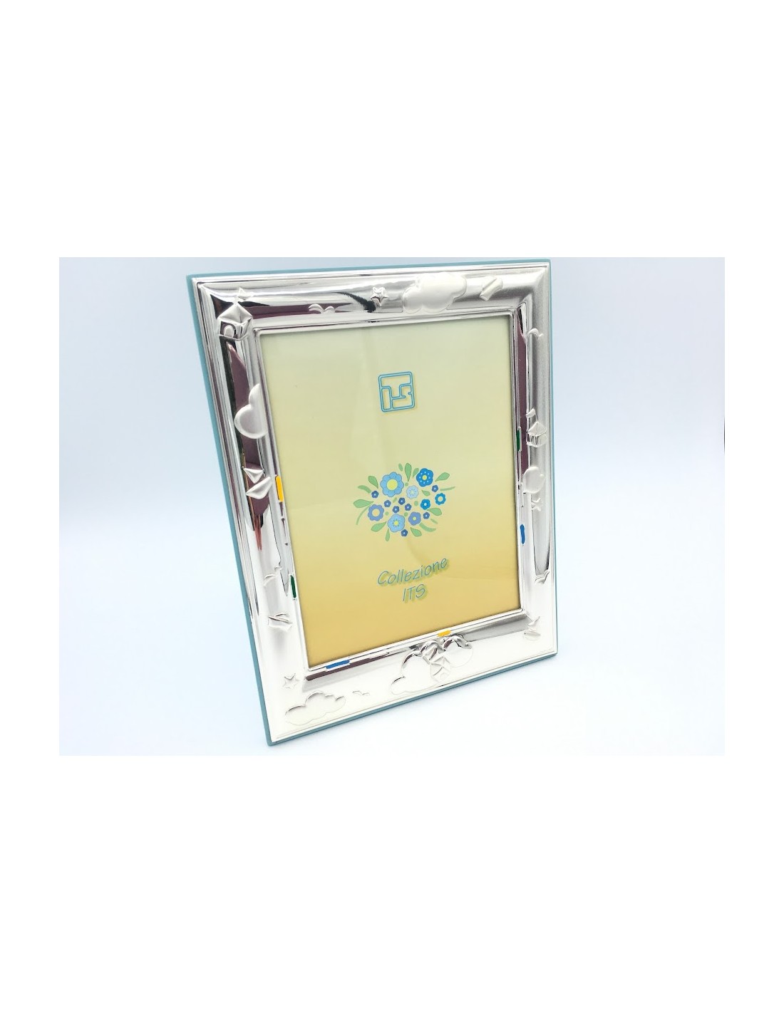 Portafotos plata laminada ,parte trasera en madera azul claro, medida foto 13 x 18 cm , medida total marco 18 x 23 cm.