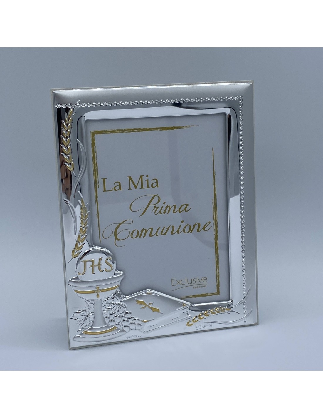 Portafotos primera comunión, greca lateral y espigas doradas. Plata de ley laminada