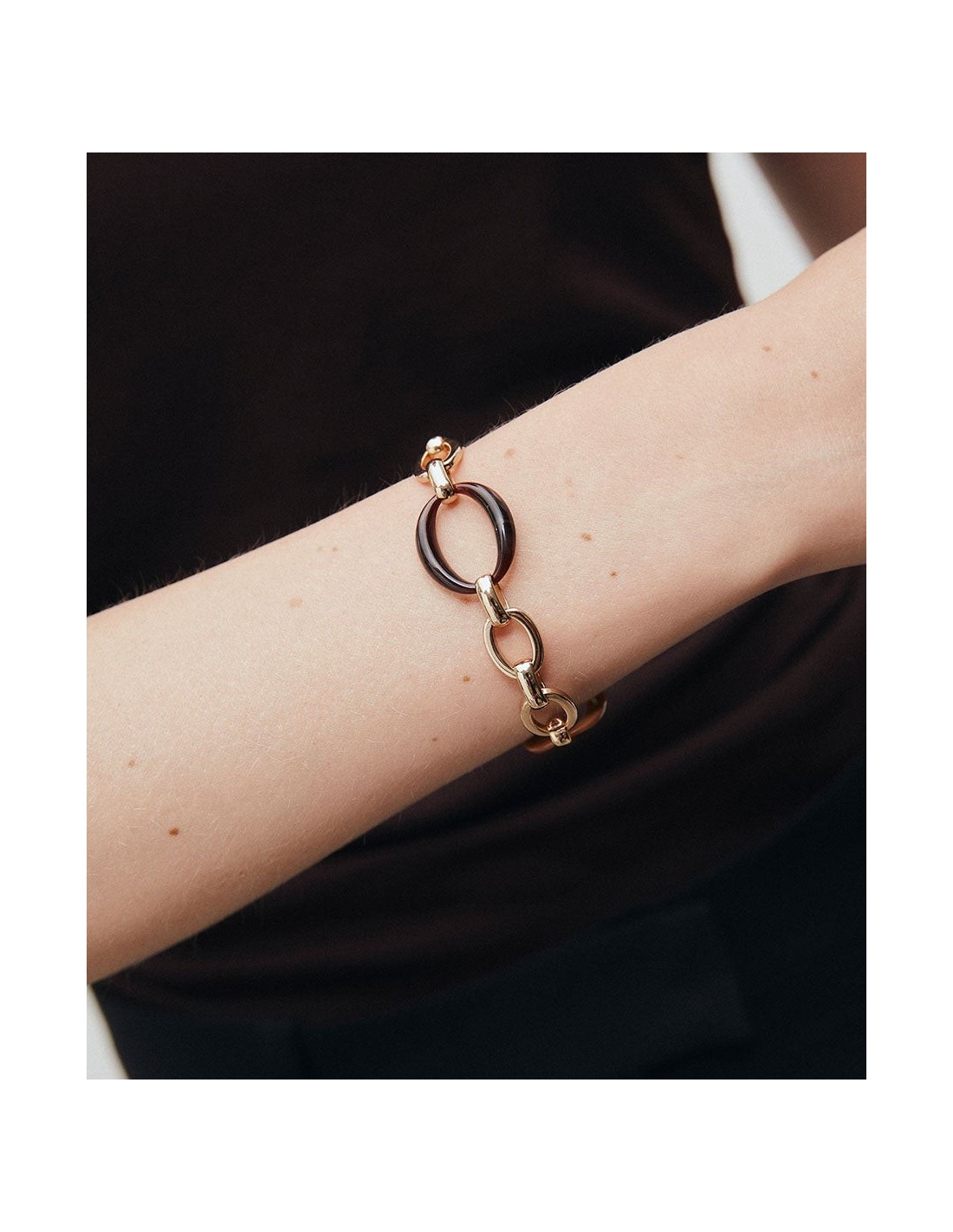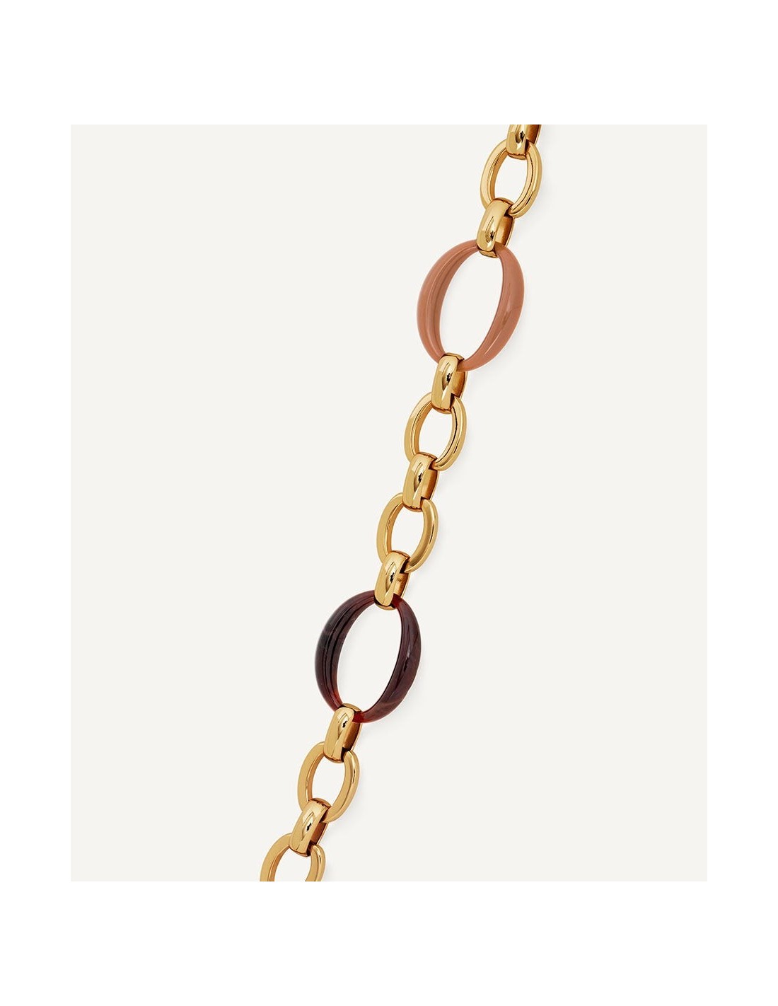 Pulsera eslabones Caramel bañada con una gruesa capa de oro macizo de 18 kt, lo que garantiza una mayor durabilidad. Destaca por el acetato y la resina en tono marrón, que aportan un aire de sofisticación en clave neutra. Tiene una longitud de 18 cm + 3 de cm de cadena ajustable. Pertenece a la colección Bold, inspirada en las tendencias actuales, con joyas de diseño y siluetas renovadas para una línea que trae color, donde dominan los tonos camel, marrón, caramelo y azul oscuro. Son piezas que, sin levantar la voz, transmiten un aire seguro, confiado y decidido.