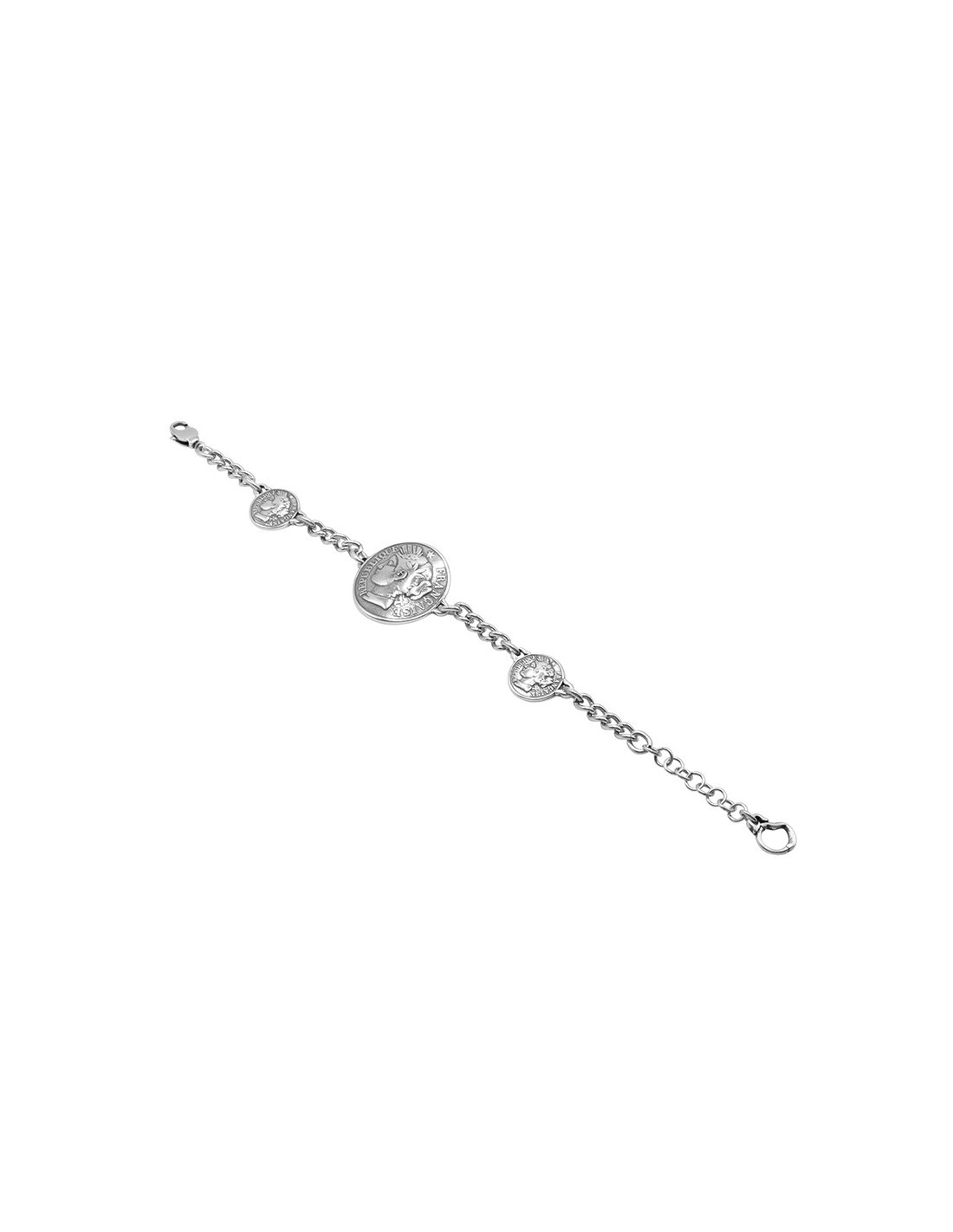 Está formada por una cadena fina bañada en plata con tres delicados motivos de monedas, una central más grande y dos pequeñas en los extremos.
