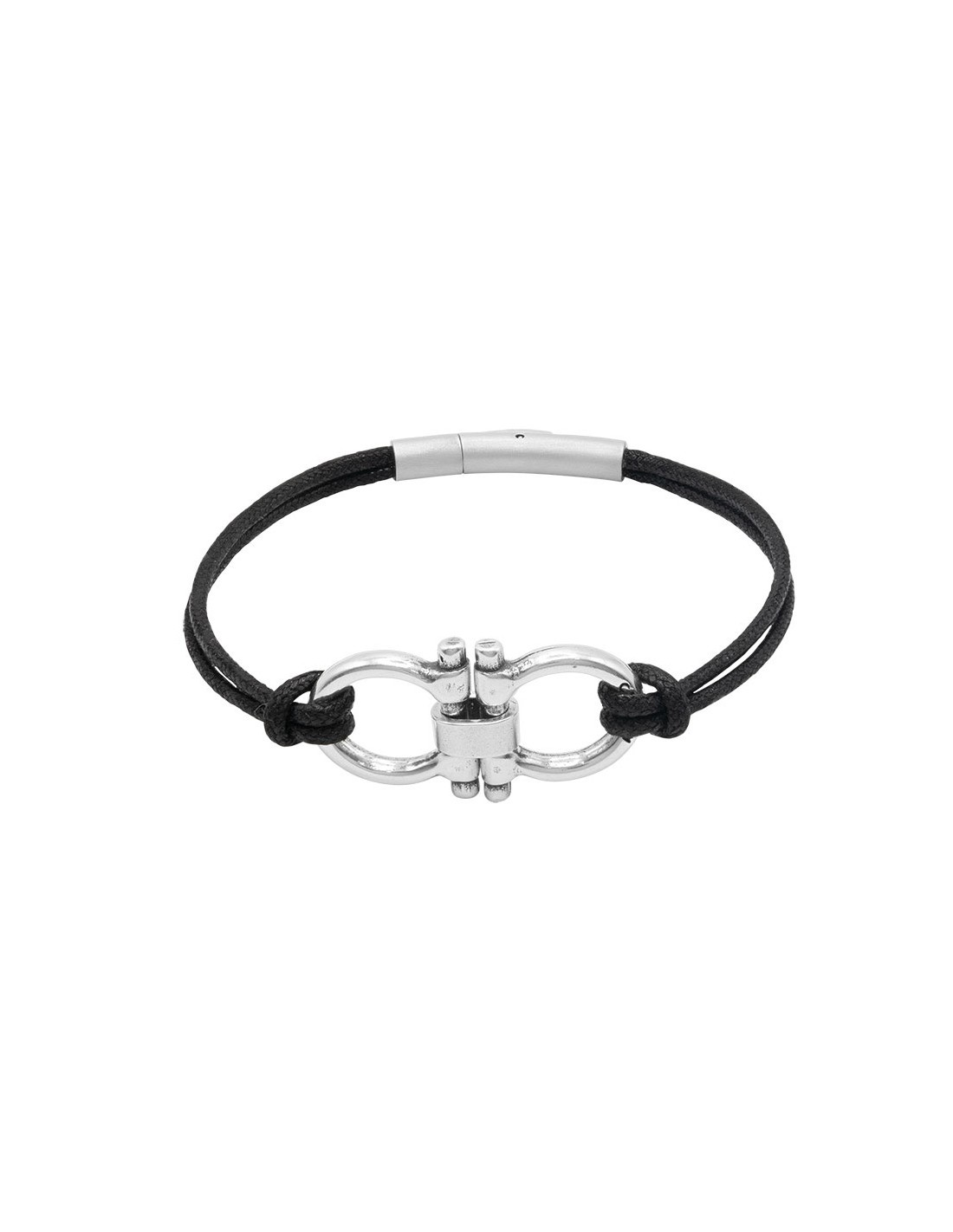 Presenta un motivo central con un diseño de doble grillete de 40mm montado sobre cuero.