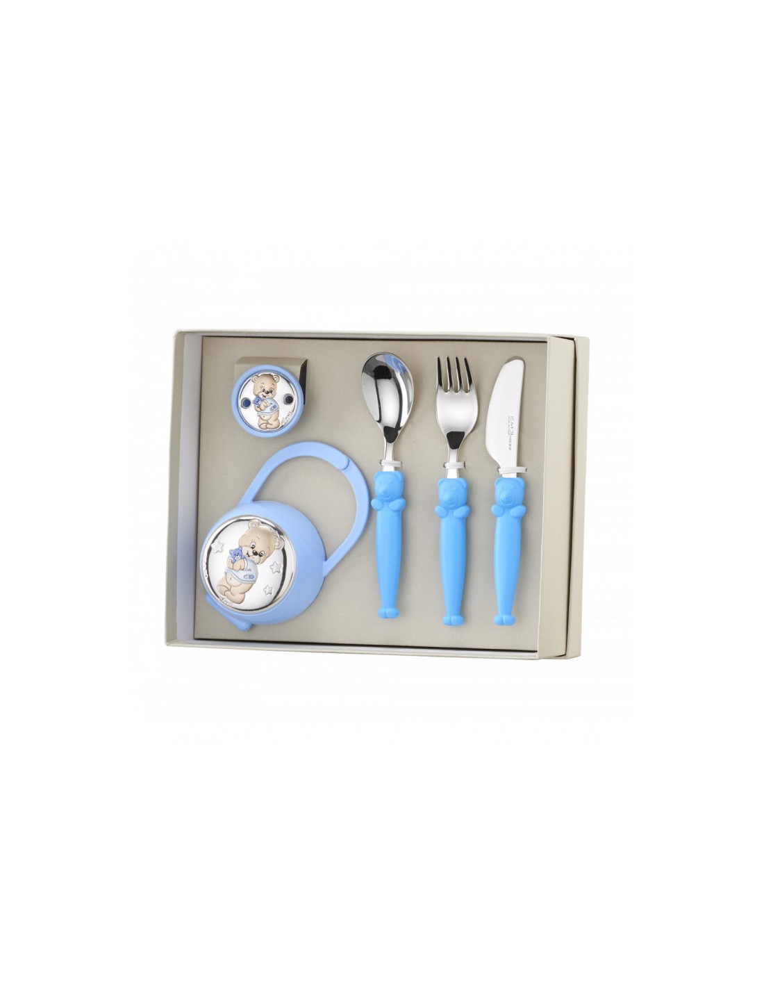 Set pinza + chupetero con placa oso en plata de ley lacado,+cubiertos en acero 18/10.