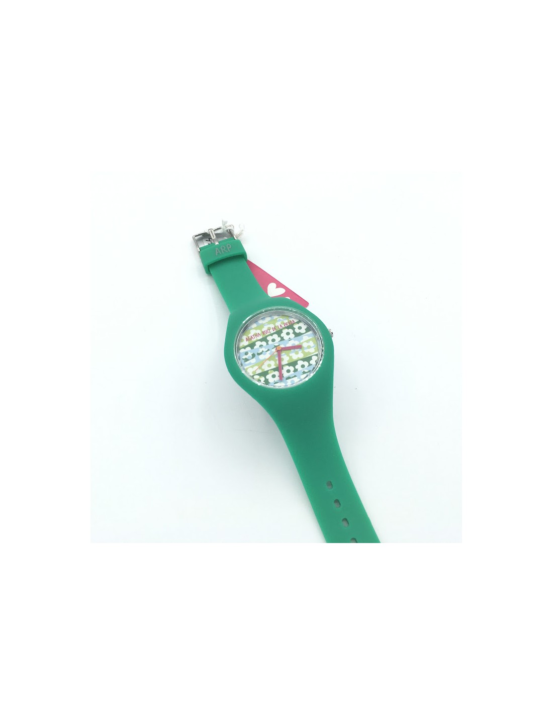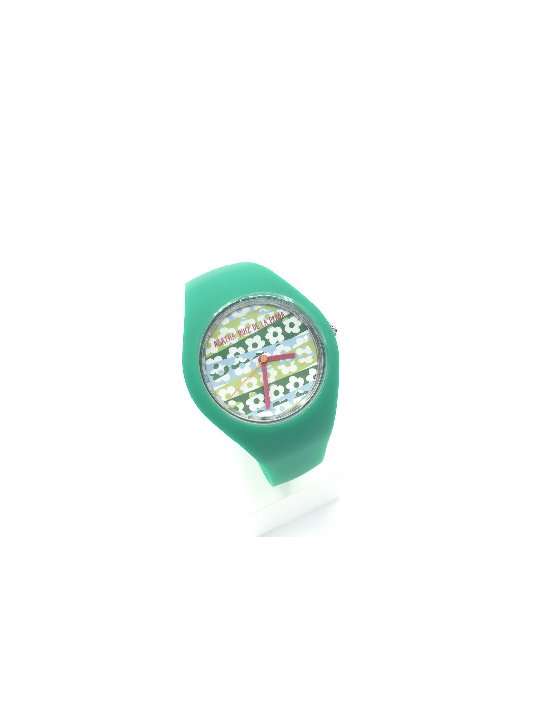 Este reloj está fabricado en poliuretano y silicona de color verde. La esfera es de color verde con florecitas, no tiene