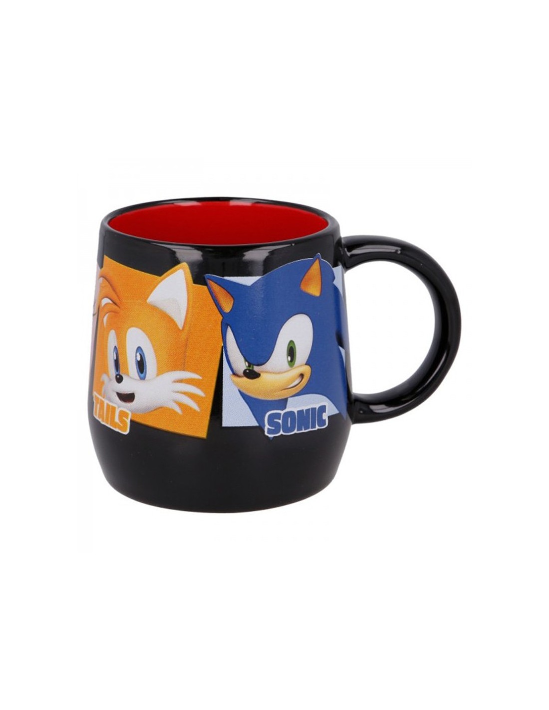 Taza de cerámica de gran calidad que tiene exterior negro e interior rojo.